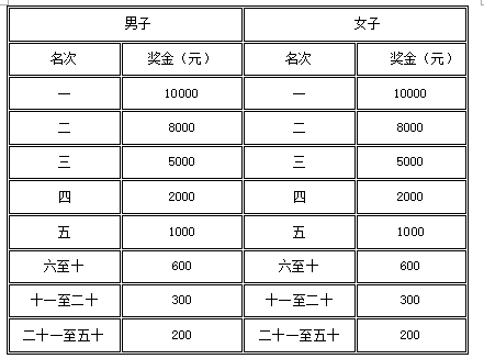 1.名次奖:男、女半程马拉松均录取前50名运动员,分别获得奖金(见下表,单位:人民币元),男、女前三名运动员各颁发领奖服一套;